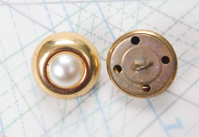 Bouton en alliage cuivreux doré, estampé, rond, coquille bombée, perle polyester nacrée centrale, culot en laiton, boucle en U insérée