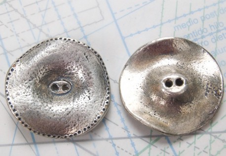 Bouton en alliage cuivreux argenté, moulé, rond ondulé, face concave, pointillés incisés en couronne, culot convexe, 2 trous