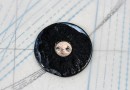 bouton en nacre, taillé, bleu teint, rond, plat, couronne décorée par 6 entailles carées non teintes ainsi que le centre en creux, verso brut poli avec entailles parallèles, 2 trous