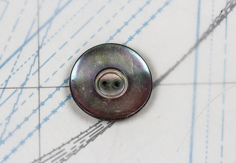 bouton en nacre, taillé, bleu teint, rond, plat, concave, en retrait avec double incision en cercle, verso brut poli, 2 trous